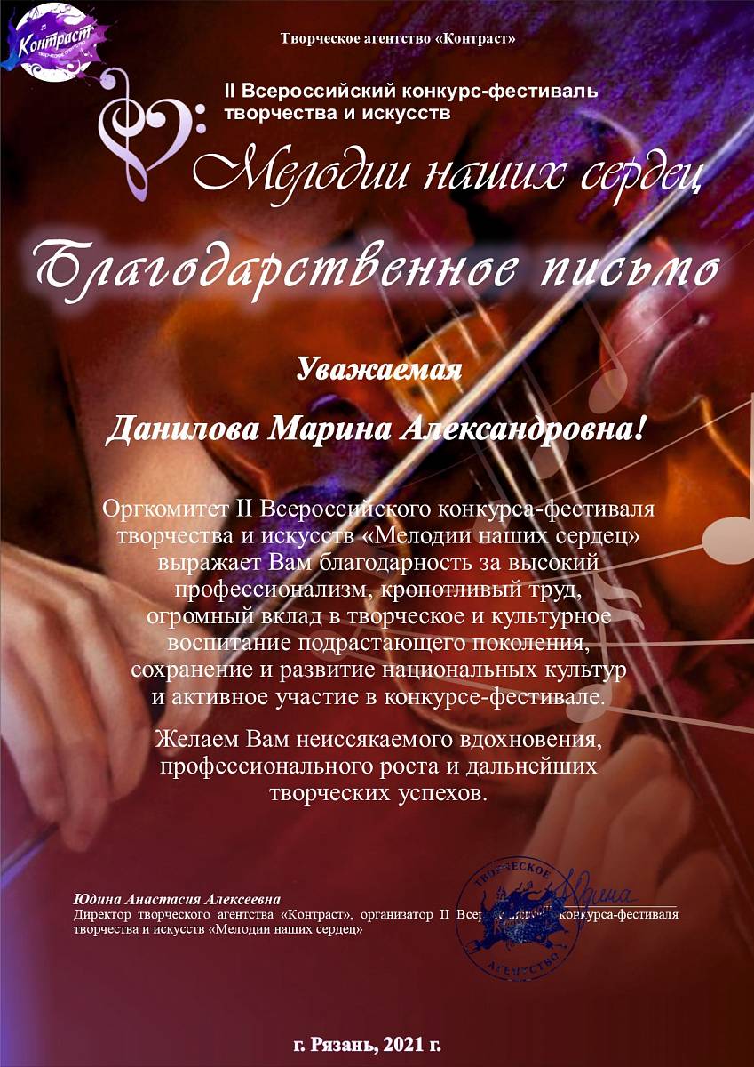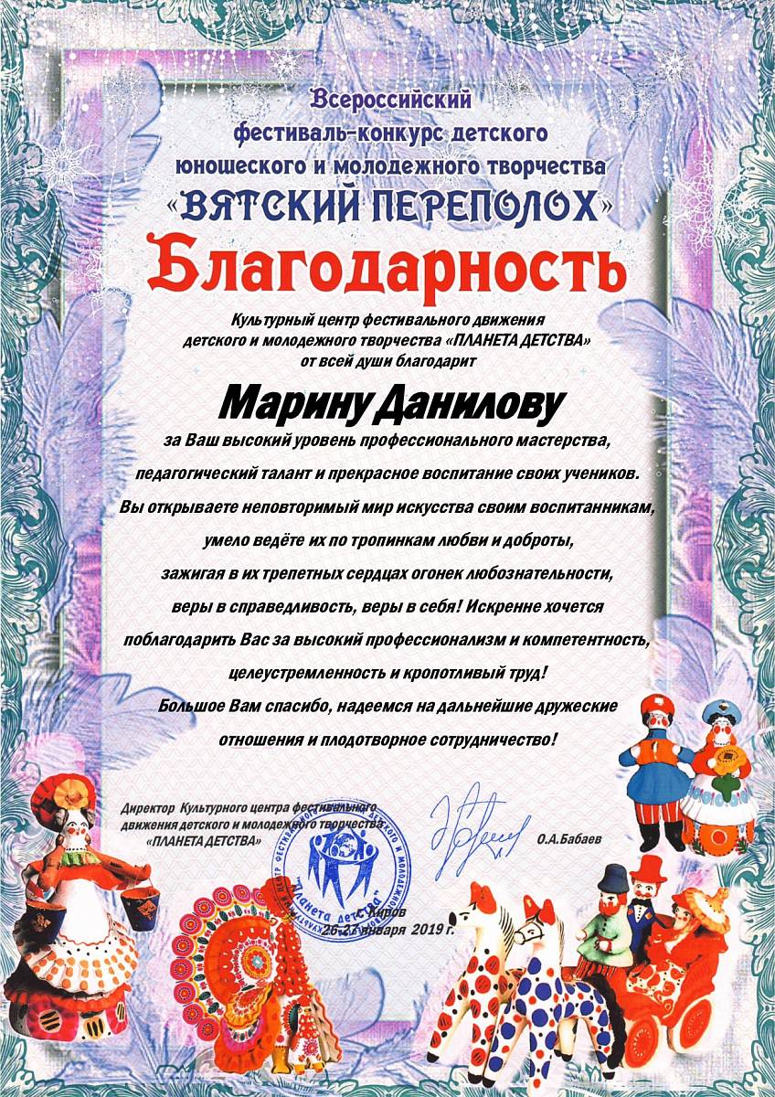Хотим выразить слова благодарности педагогу наших ребятишек Марине Александровне Даниловой. Наши дети занимаются в Доме детского творчества уже не первый год, и стоит отметить, что здесь все серьезно: