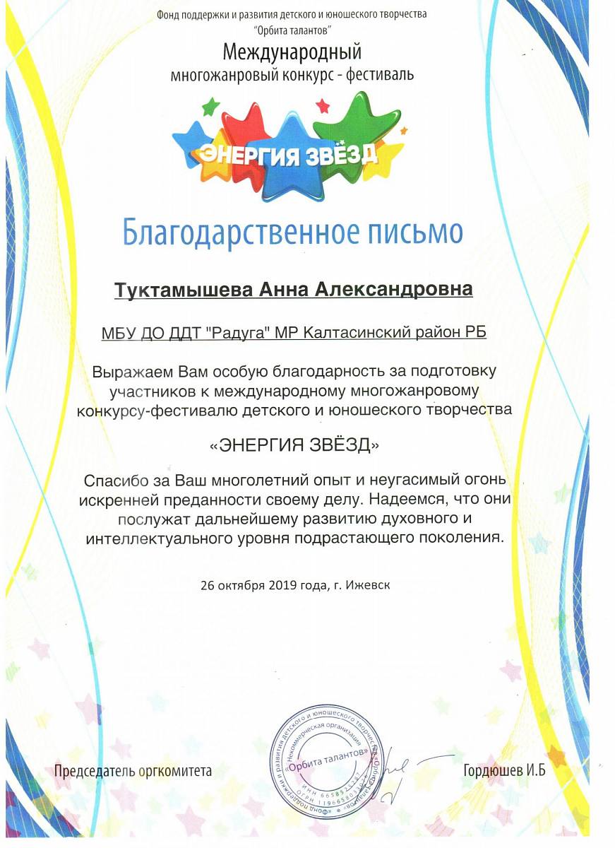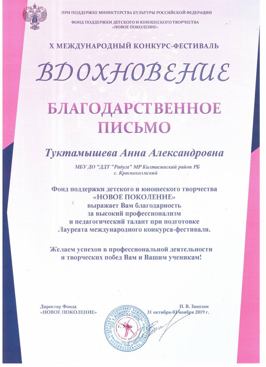 БЛАГОДАРНОСТЬ ПЕДАГОГУ ХОРЕОГРАФИИ ДОМА ДЕТСКОГО ТВОРЧЕСТВА «РАДУГА» АННЕ АЛЕКСАНДРОВНЕ ТУКТАМЫШЕВОЙ