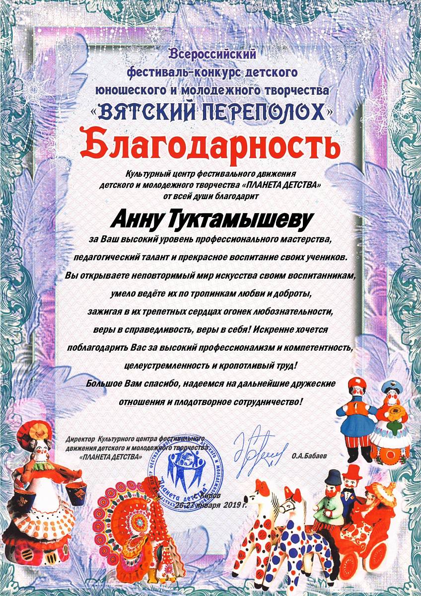 Культурный центр фестивального движения детского и молодежного творчества "Планета Детства"от всей души благодарит Анну Туктамышеву и Марину Данилову за высокие профессиональные качества, проявленные при подготовке конкурсантов V Всероссийского фестиваля-конкурса детского, юношеского и молодежного творчества "Вятский переполох".