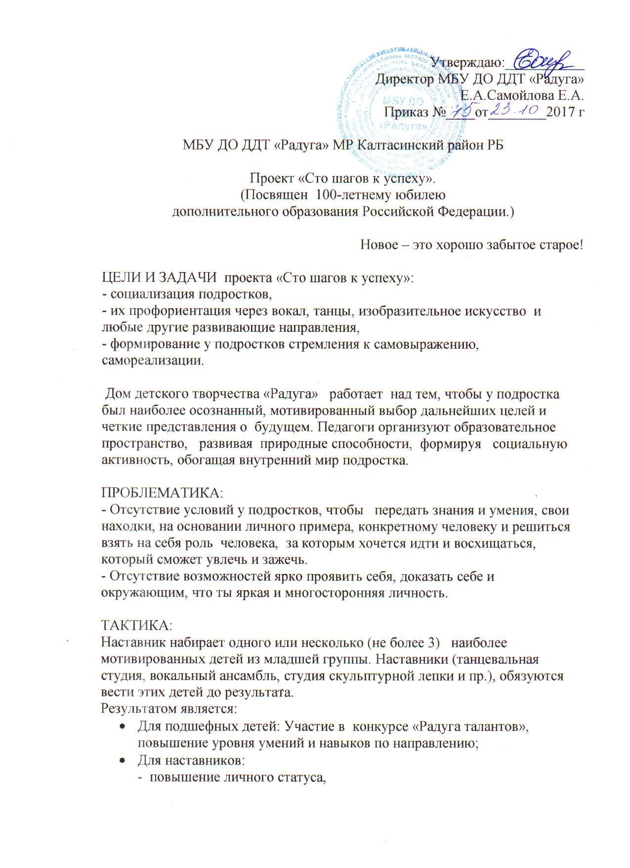 МБУ ДО ДДТ "Радуга" МР Калтасинский район РБ. Проект "100 шагов к успеху".