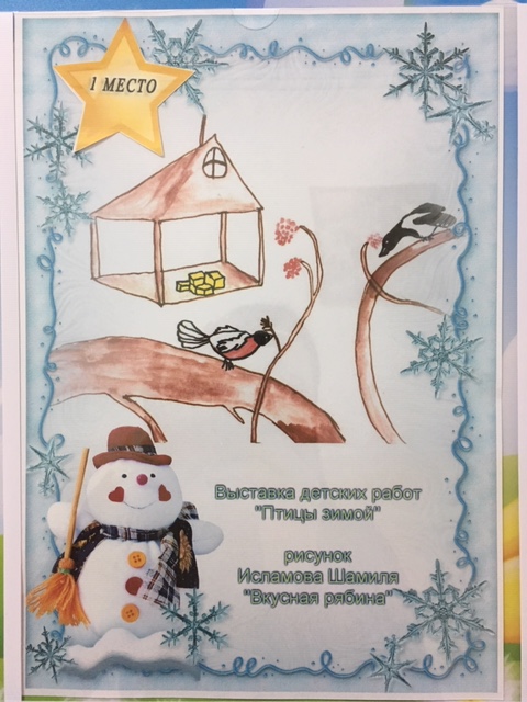 19 ноября в ДДТ «Радуга» была организована выставка детских работ «Птицы зимой». Рисунки подготовили воспитанники 7-9 лет из групп «Умельцы» и «Муравьишки» студии «Сказка» после проведения тематических уроков по данной теме. Самые лучшие работы отмечены призовыми местами. Ими оказались: работа «Вкусная рябина» Исламова Шамиля из группы «Умельцы», и работа «Пёрышко на счастье» Логинова Никиты из группы «Муравьишки». Поздравляем победителей с 1 местом!