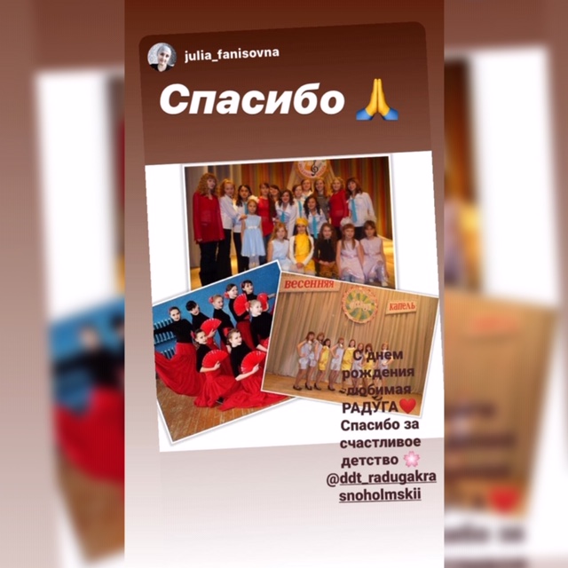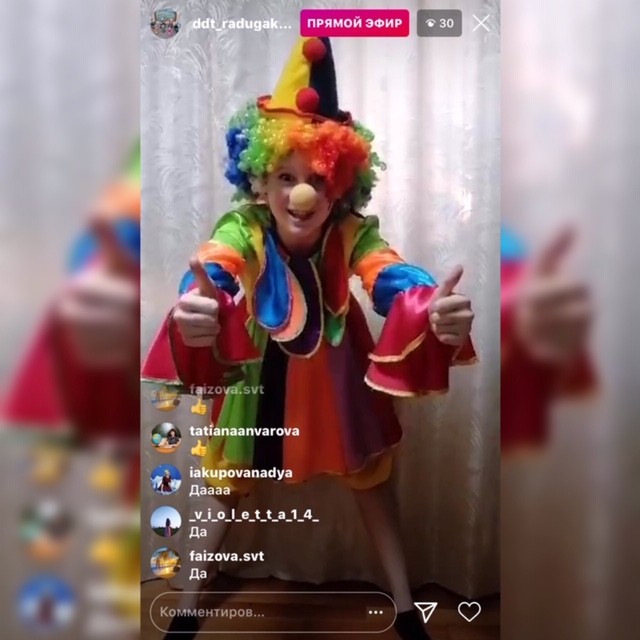 29 апреля международный день танца! Поздравить всех приходил клоун в прямом эфире Инстаграмм, где провёл тренировку для всех танцоров. На странице в Инстаграмм проходит эстафета «А вам слабо?», между воспитанниками Радуги, где дети друг другу придумывают задания и выполняют их в истории приложения.Театральная группа проводит среди воспитанников, педагогов и выпускников эстафету фотографий выступлений на сцене и готовит онлайн-концерт ко Дню Танца. В 2020 году ДДТ «Радуга» 20 лет! Мы продолжаем конкурс на лучшее поздравление с юбилеем! Все очень активно участвуют и присылают оригинальные поздравления.