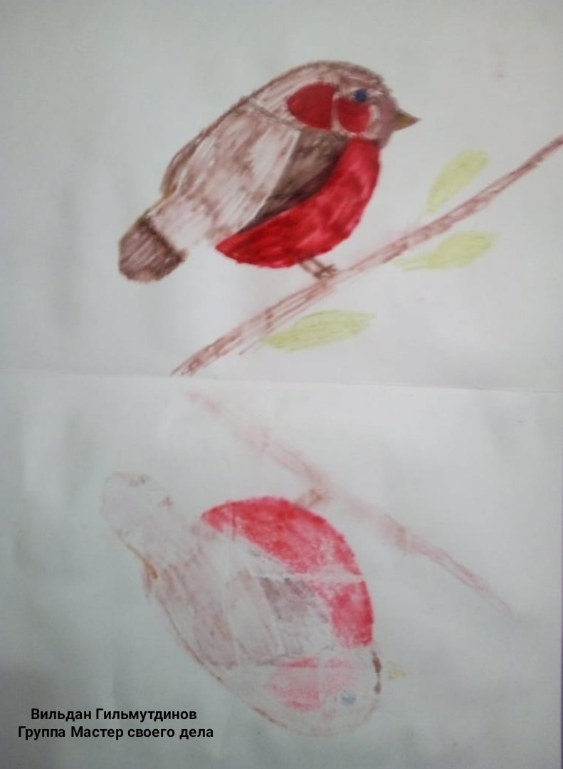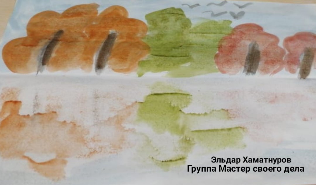 Старшим детям была предложена тема занятия: «Знакомство с нетрадиционными способами рисования "Монотипия"». Они подготовили рисунок "Отражение в реке". Срисовали пейзаж, применяя этот простой способ монотипии в своем изображении отражения в воде. По итогам первого занятия получились три прекрасные выставки.