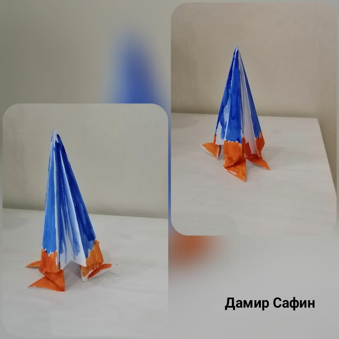 Второе занятие у школьников на этой неделе "Запускаем ракету в космос!" на тему "Конструирование из бумаги. Закрепление знаний об оригами". Было предложено школьникам рассмотреть с ребенком порядок изготовления ракеты, затем смастерить ракету из бумаги, а потом установить ракету для полета и сделать фото, как она взлетает.