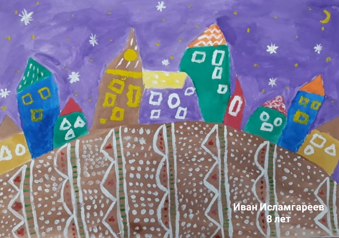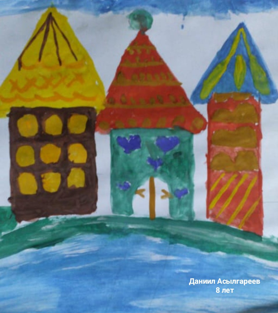 Первое занятие у школьников было "Сказочная улица" на тему "Закрепление знаний об орнаменте, рисование орнамента из полос и точек кончиком кисти". Вначале детям предложили рассмотреть рисунок "Улица", потом нарисовать красками или маркерами дома по желанию ребенка, подождать, пока краска высохнет и в конце работы украсить рисунок: дома, деревья, землю орнаментом, который придется ребенку по душе.