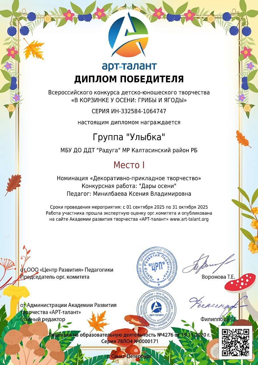 Обучающиеся группы "Улыбка" приняли участие во Всероссийском конкурсе детско-юношеского творчества "В корзинке у осени: грибы и ягоды", который проходил с 1 сентября по 31 октября текущего года на сайте Академии развития творчества "Арт-талант". Ребята заняли 1 место в номинации "Декоративно-прикладное творчество" с работой "Дары осени". Пожелаем нашим первоклассникам ярких работ и новых побед!