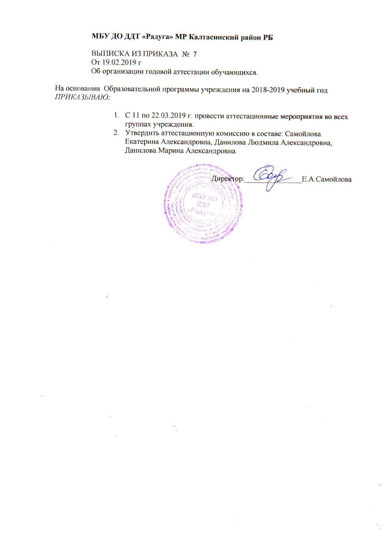 Выписка из приказа №7 от 19.02.19г. "Об организации годовой аттестации обучающихся"